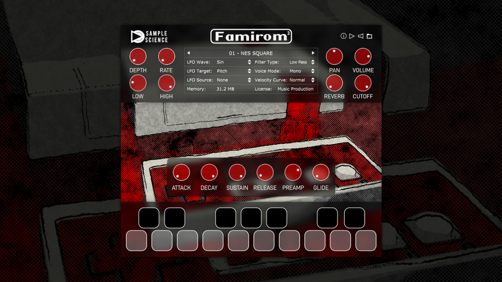 The waveforms used by the plugin were sampled from two vintage Famirom game systems bought many years ago. Their sounds were meticulously sampled and edited to be as close as possible to the real thing. Unlike other emulations, Famirom is based on recordings from an original NES hardware sound chip.