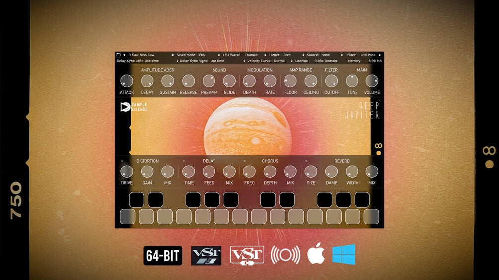 Deep Jupiter is an analog bass sound module featuring the sound of a famous 80s synthesizer with the name Jupiter in it. The plugin has 8 multi-sampled raw bass suite for electronic genres like synthwave, chillwave, retrowave, and synthpop. The sounds in this module are public domain (not the plugin itself which is copyrighted).