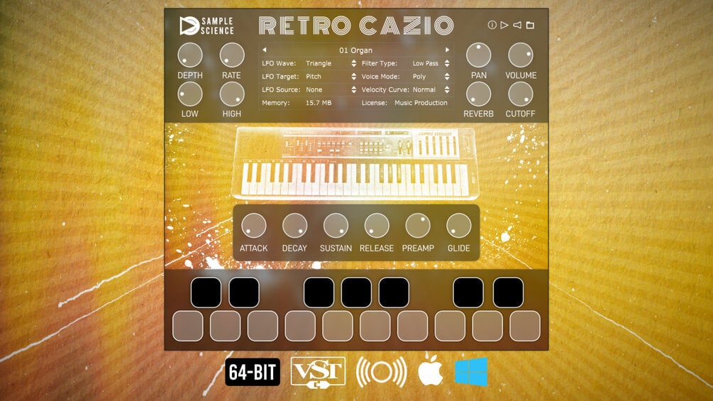 Retro Cazio is a rompler based on an old toy keyboard from the 80s. All the sounds of the MT-100 have been sampled using high-end recording equipment. Released in 1983, the MT-100 uses the NEC D931 chip to generate its digital sound.
