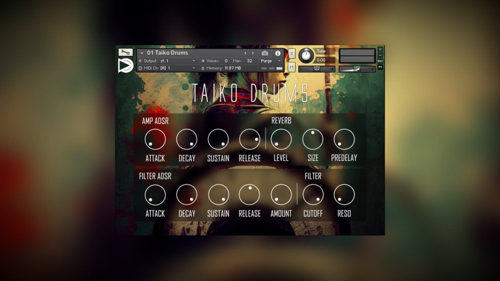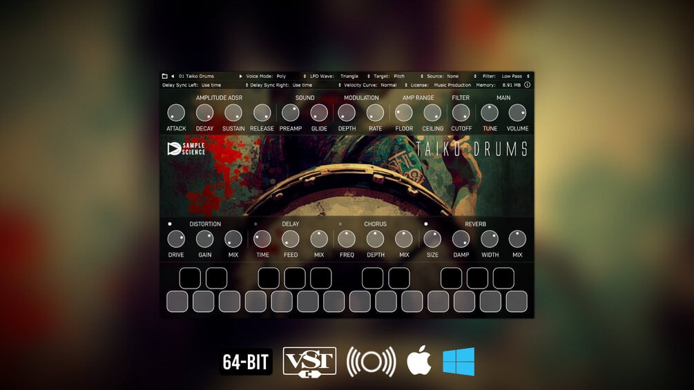 Taiko Drums is a virtual instrument featuring the sound of taiko drums. A synthesizer has been used to create this traditional Japanese instrument in virtual form. The result is epic and cinematic!