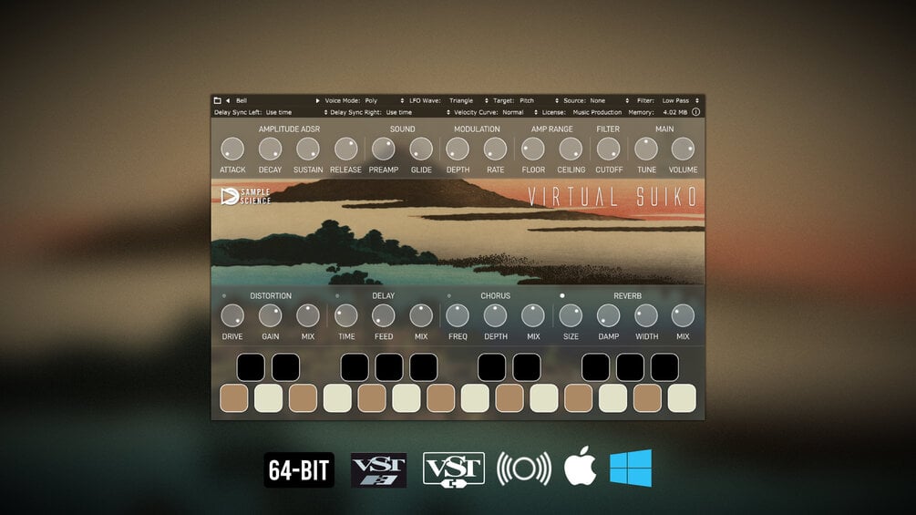 Virtual Suiko has all the original 8 sounds of the instrument plus 4 effects, a multi-LFO, highpass/lowpass filter and more!