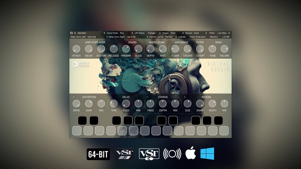 Sound manipulation is facilitated through integrated ADSR amplitude envelopes and four DSP effects. Additionally, the software incorporates a multi-LFO feature, enabling modulation of pitch, pan, or amplitude.